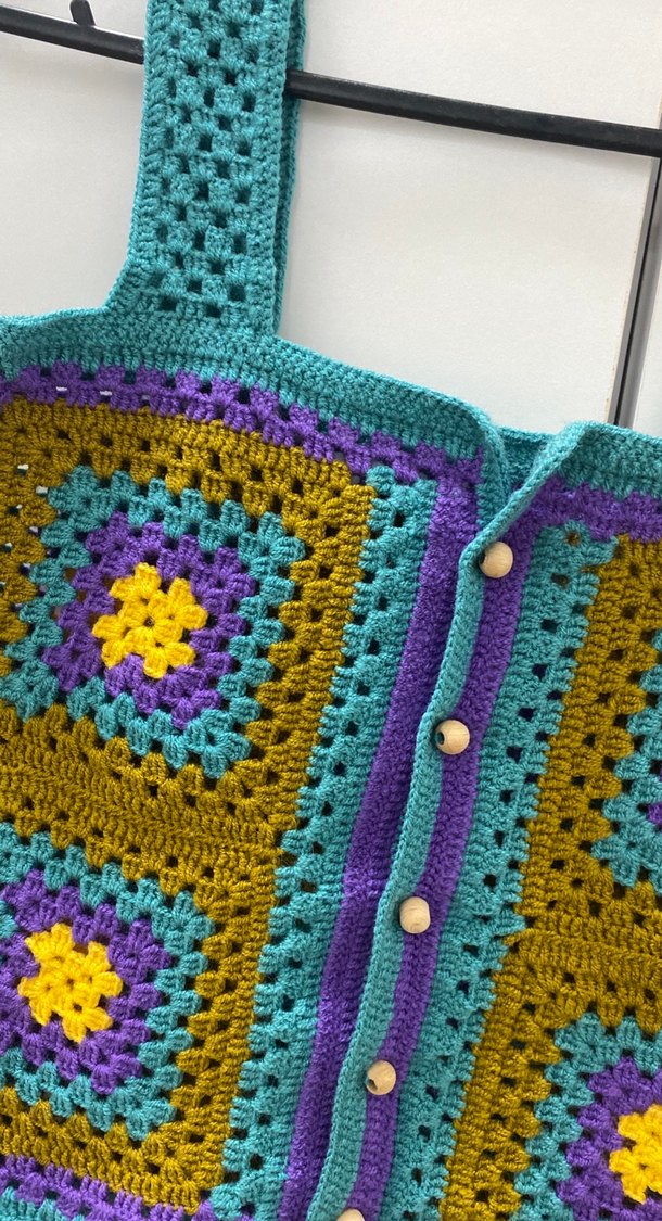 Düğmeli, çok renkli örgü kumaştan kadın çantası. Hafif, bohem desenli ve günlük kullanıma uygundur.