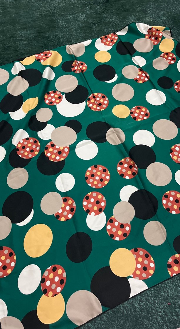 Kadınlar için düğmeli, çok renkli daire desenli, koyu yeşil zeminli, sentetik kumaştan retro tarzda