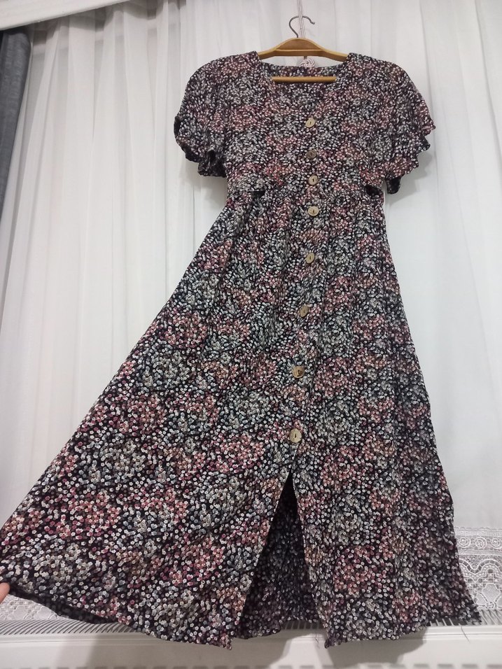 Düğmeli, çok renkli, desenli ve uzun bohem elbise. Sentetik kumaştan, V yakalı, askılı kollu ve bol kesimdir.