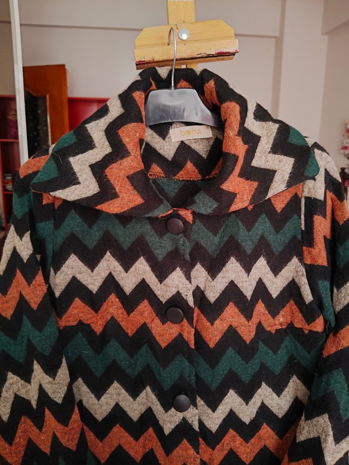 Düğmeli, uzun ve bol kesim kadın kabanı, tekstil kumaştan üretilmiş. Çok renkli zigzag desenleriyle retro ve bohem tarzlarını yansıtıyor.