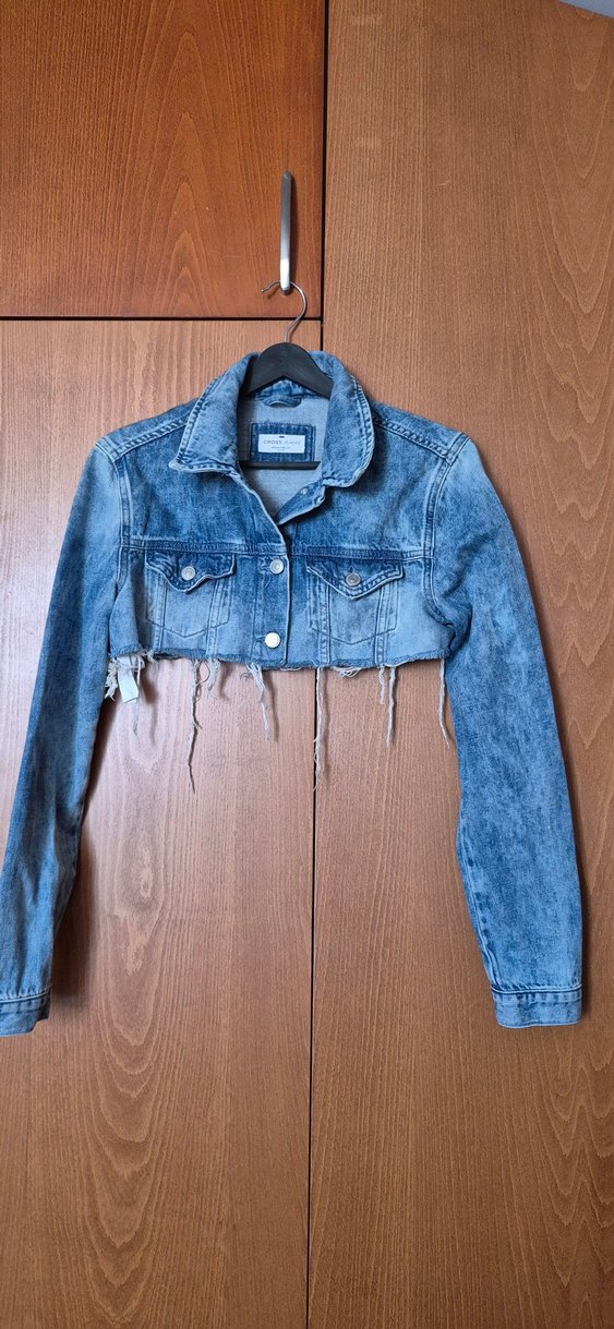 Düğmeli, uzun kollu ve kesik uçlu crop denim ceket. Denim, rahat ve şık bir sokak stili parçası.