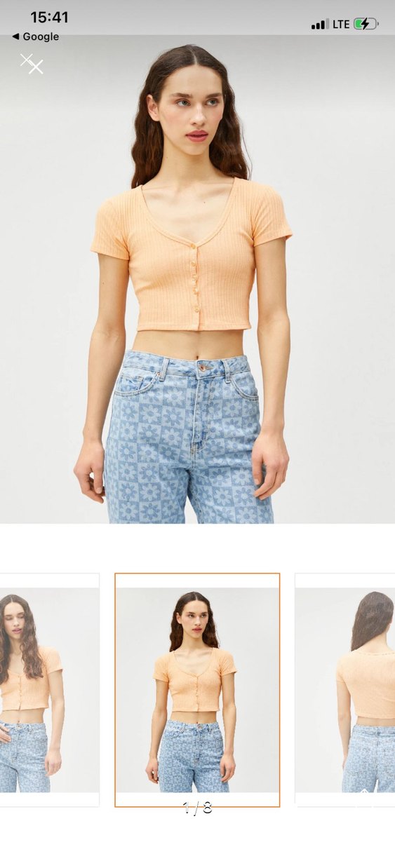 Somon renkli crop top, V yakalı, kısa kollu ve önünde düğme detaylıdır. Rahat kesimi ve kısa boyu ile yumuşak denim kumaştan üretilmiştir. Günlük sokak stili için uygundur.
