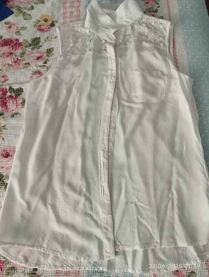 Pamuklu, kolsuz, düğmeli ve yakalı beyaz gömlek. Omuzlarda bohem tarzı dantel detayları bulunur. Rahat kesim.