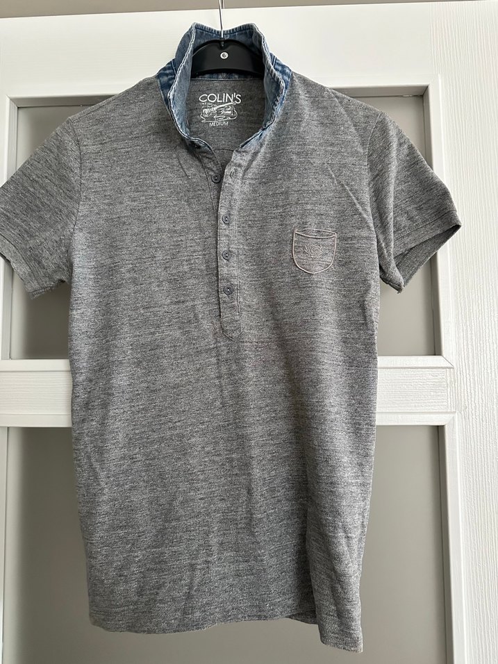 Düğmeli ve denim detaylı yakasıyla gri, baskılı desenli, kısa kollu, fitted kesim erkek polo tişört. Sokak stiline uygun, küçük cep detayı bulunur.