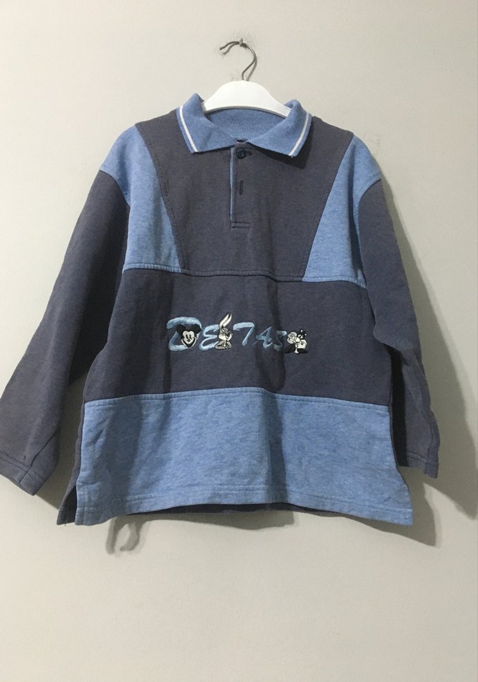 Düğmeli, uzun kollu, yakalı ve bol kesim erkek sweatshirtü. Denim kumaştan, mavi ve gri renklerde, baskılı detaylara sahip sokak stili için uygun.