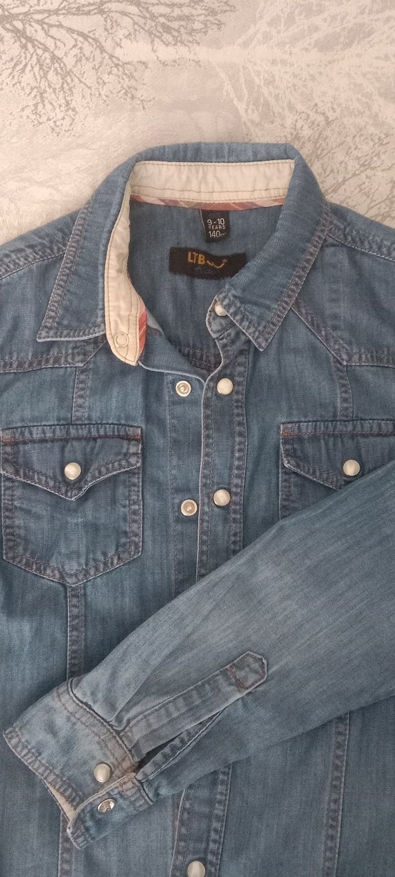Düğmeli, uzun kollu, yakası kesimli denim kadın gömleği. Mavi renkte, normal kesim, gündelik kullanıma uygun. 9 10 yaş gömlek