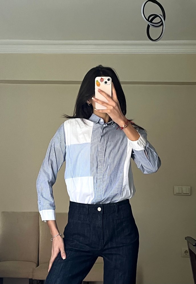 Düğmeli, uzun kollu, yakalı denim gömlek, mavi ve gri tonlarda batik desenli, günlük rahat stil için uygun.