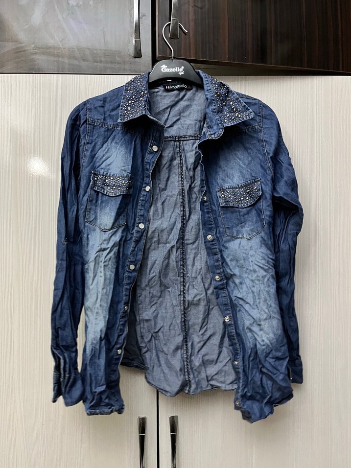 Bol kesim, düğmeli denim kadın gömlek. Yaka ve ceplerde süslemeler bulunur. Sokak stiline uygun, günlük kullanıma ideal mavi-gri tonlarında.