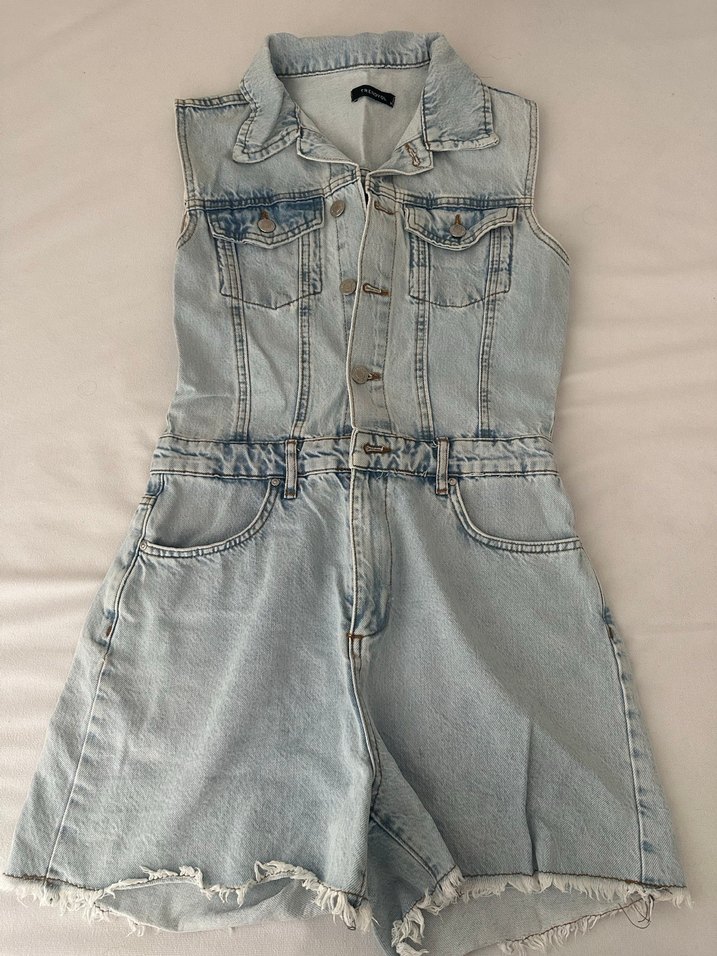 Düğmeli, kolsuz denim tulum. Bel kısmı oturan ve orta boy şortlu. Yaka ve ön ceplerle günlük sokak stili için uygun.