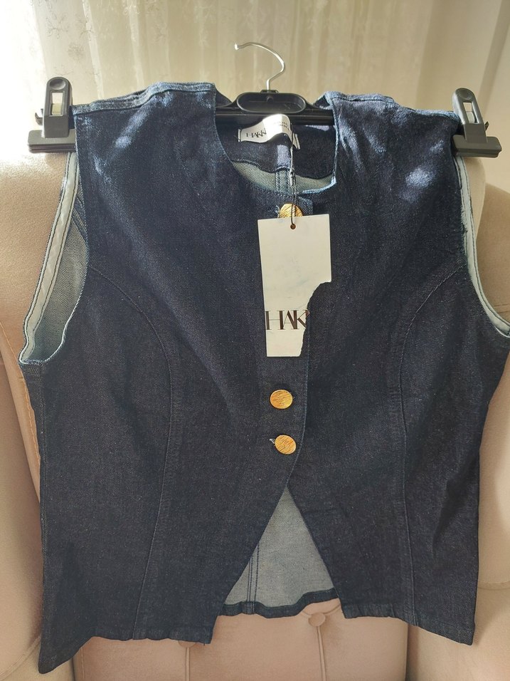 Düğmeli, notlu yakalı, kolsuz denim yelek. Normal boy ve slim kesim, günlük rahat sokak stili için ideal. Derin mavi renkte, sade tasarım.