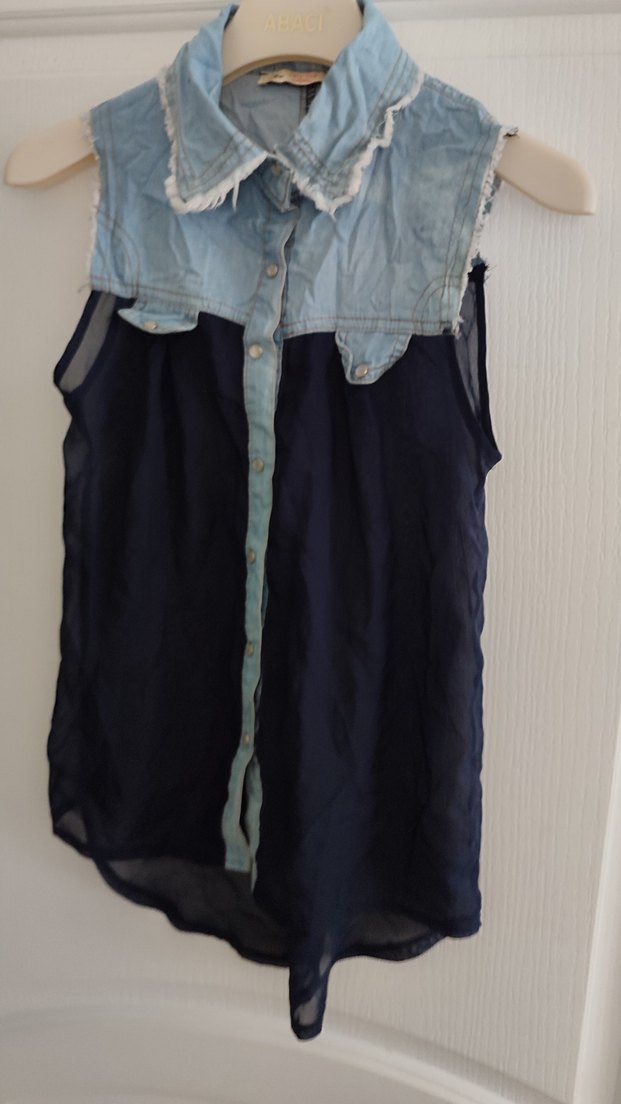 Düğmeli, denim yakalı, kolsuz, bol kesim kadın gömlek. Günlük kullanıma uygun, koyu renk ve sade tasarıma sahip.