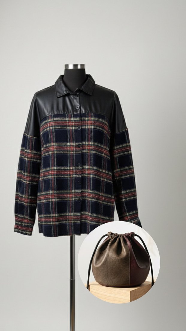 Düğmeli Deri Detaylı Ekose Kadın Gömlek