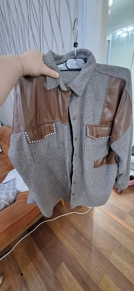 Kadın ceket, düğmeli ve uzun kollu, kahverengi deri ve gri kumaş kombinli. Normal midi boyda, notched lapel yakalı, salaş kesim, günlük kullanıma uygun.