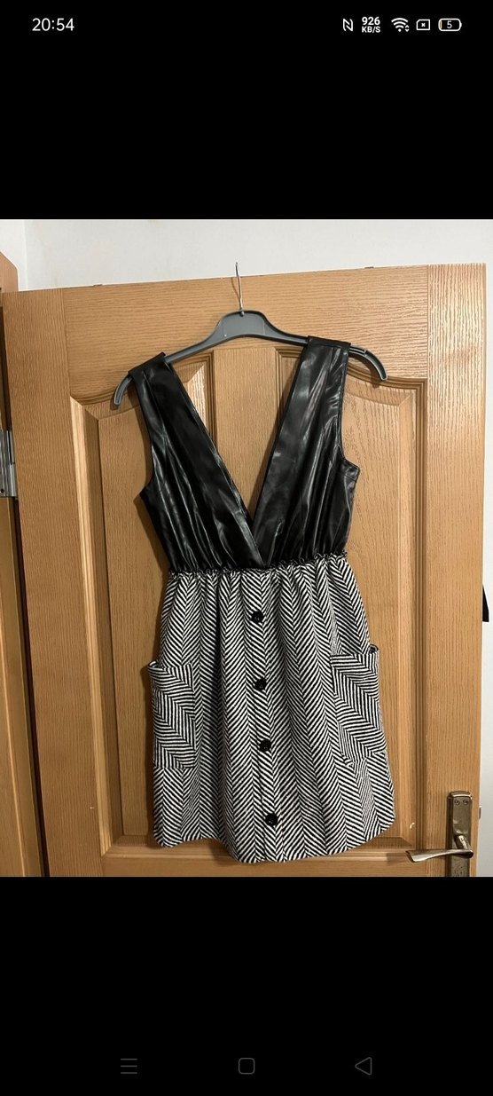 Siyah deri V yakalı üst kısmı ve düğmeli zebra desenli gri etek kısmı olan kolsuz, vücuda oturan midi elbise.
