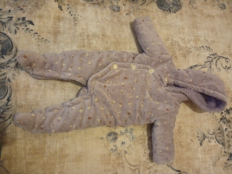 Üst kısmı düğmeli, alt kısmı ise çıt çıtlı, minik mor çicek desenli detaylara sahip yumuşak mor bebek kız tulumu, 0,3 aylık arası..