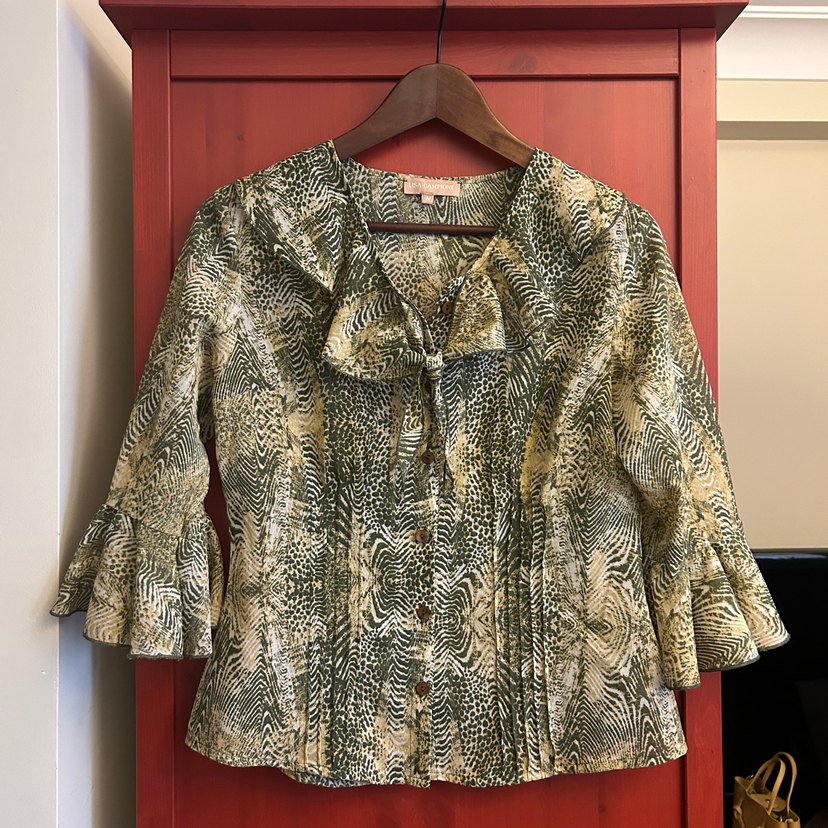 Düğmeli, yılan desenli, parlak kahverengi hamile bluzu. Uzun kollu, yakası kesik ve bol kesimdir. Vintage bohem tarzı ve ofis şıklığını birleştirir.