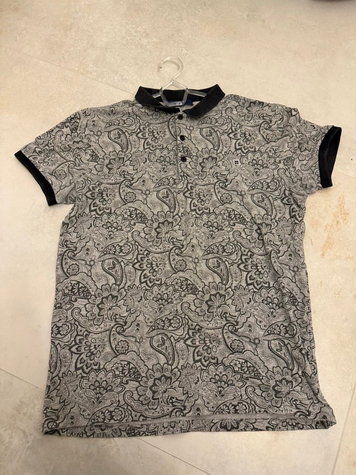 Düğmeli, yakalı ve kısa kollu bu gri erkek polo tişört, desenli ve ince sentetik kumaştan yapılmıştır. Günlük kullanım için uygundur.