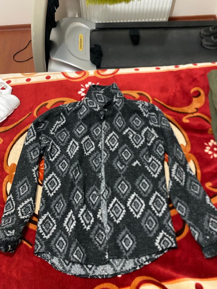 Düğmeli, yüksek yakalı, desenli koyu gri erkek polar sweatshirt. Uzun kollu ve bol kesim, günlük kullanıma uygun. ❄️