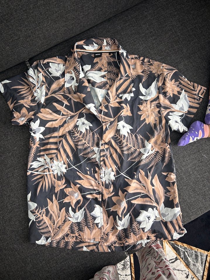 Kahverengi tonlarında baskılı, kısa kollu, düğmeli ve yakalı erkek gömleği. Rahat kesimi ve sentetik kumaşıyla günlük kullanıma uygundur.