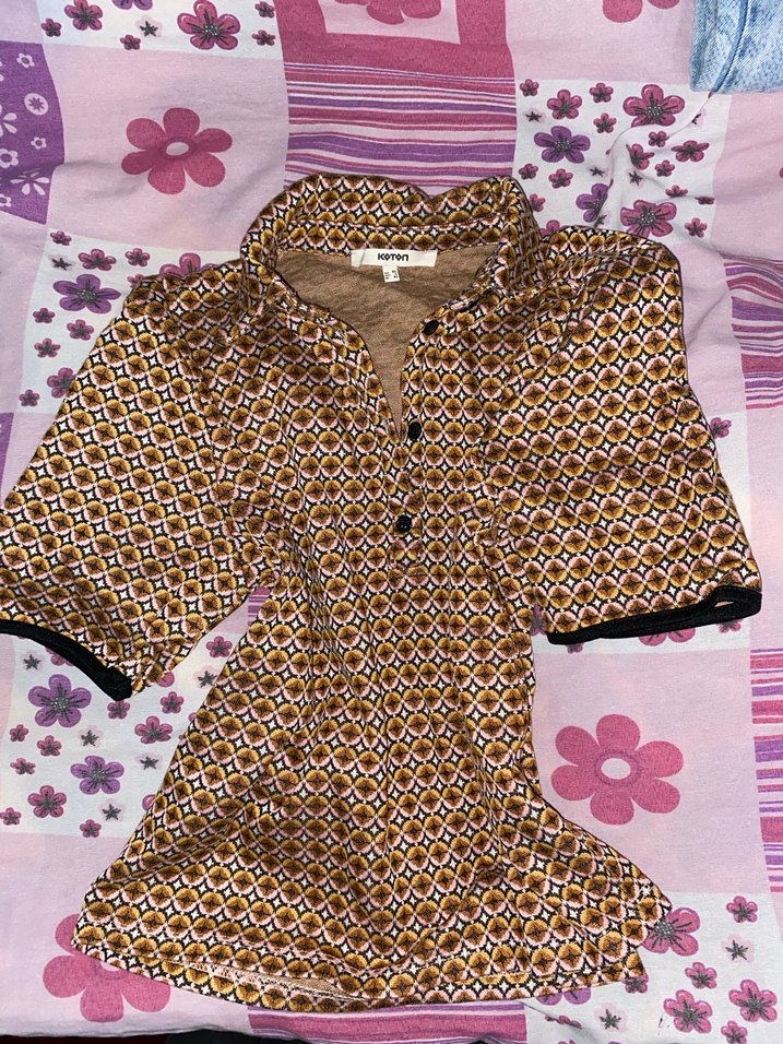 Düğmeli, kısa kollu, desenli kahverengi kadın gömleği. Yaka detaylı, bol kesim ve yumuşak sentetik kumaştan, vintage bohem tarzda. Sadece bir kez kullandım