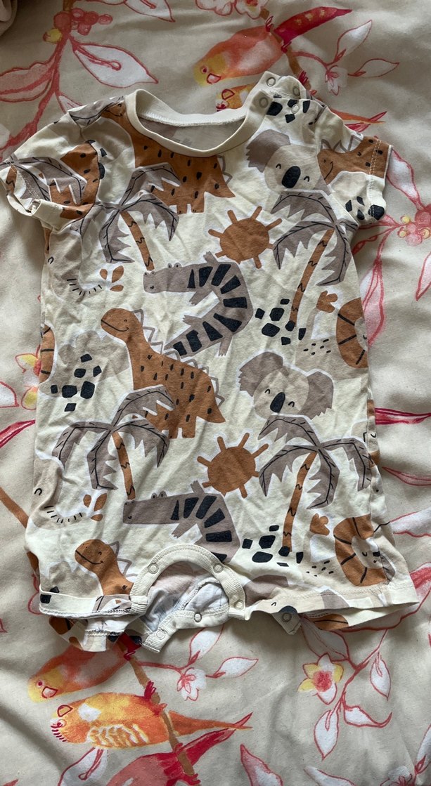 Kısa kollu, düğmeli ve yakalı bebek tulumu. Yumuşak sentetik kumaştan, açık kahverengi hayvan desenleriyle sokak stili için uygundur.