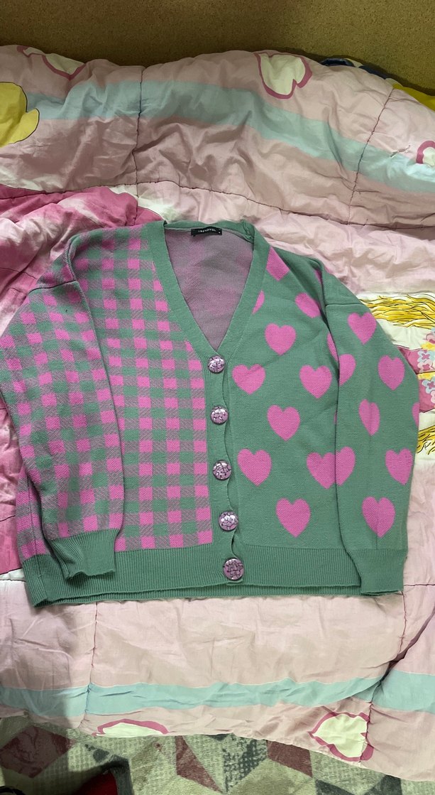 Düğmeli, uzun kollu, V yakalı, gevşek kesim örme hırka. Pastel pembe kalp ve kare desenleriyle midi boy, rahat sokak stili için uygun.