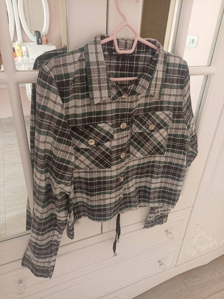 Düğmeli ön, uzun kollu ve yakası kesik detaylı kadın gömlek. Bol kesim, mini boy ve yeşil ekose desene sahip, sentetik kumaştan üretilmiştir.