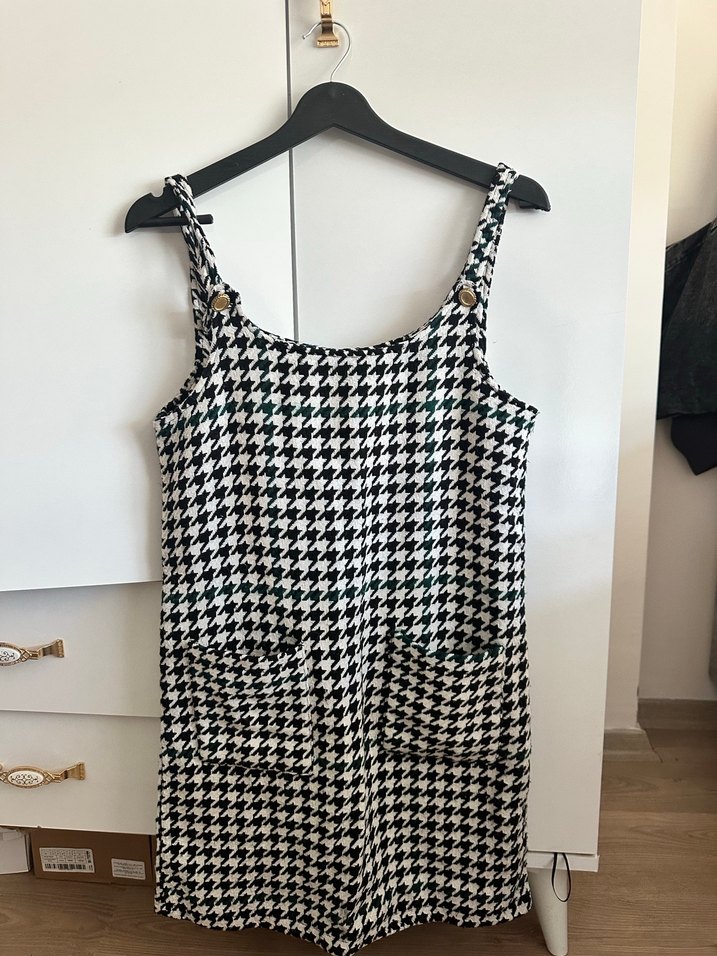 Gri ve beyaz ekose desenli, düğmeli askılı kadın tulum. Bol kesim ve halter yaka ile günlük kullanıma uygundur. Ceplidir.