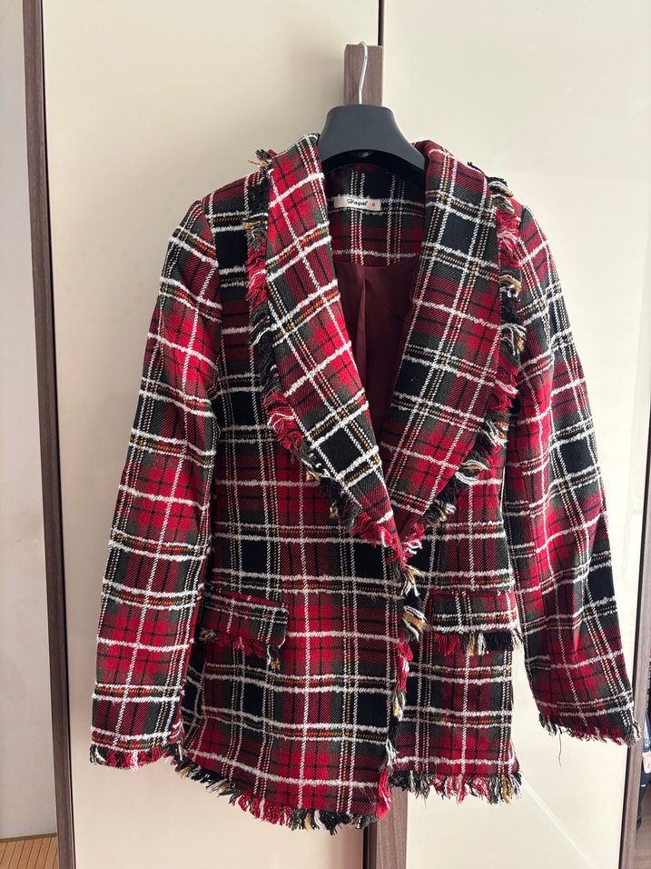 Düğmeli Ekose Desenli Bordo Kadın Blazer