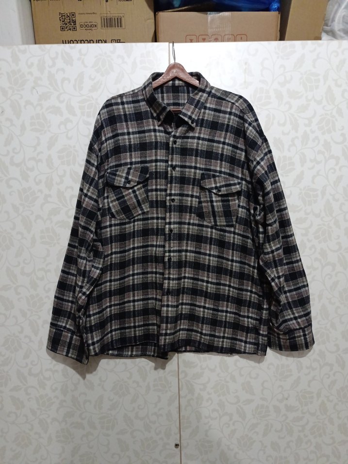 Düğmeli, uzun kollu, yakalı erkek gömlek. Ekose desenli, bol kesim ve gri-kahverengi tonlarında, günlük rahat stil için uygun.