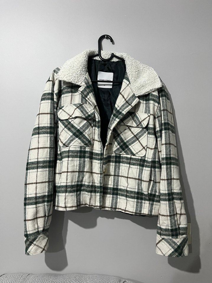 Düğmeli ve yakalı, uzun kollu kadın ceket, gömlek . Gri-beyaz ekose desene sahip, rahat kesim ve orta boy uzunlukta. Yumuşak, sıcak kumaştan üretilmiş, günlük rahat kullanıma uygun.