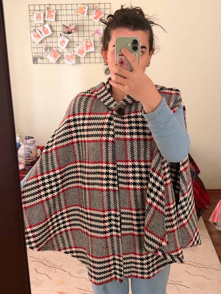 Gri ve kırmızı ekose desenli, tek düğmeli, yüksek yakalı, yumuşak kumaştan rahat kesim kadın panço, tüm detayları fotoğraflarda gösterdim L-XL giyebilir