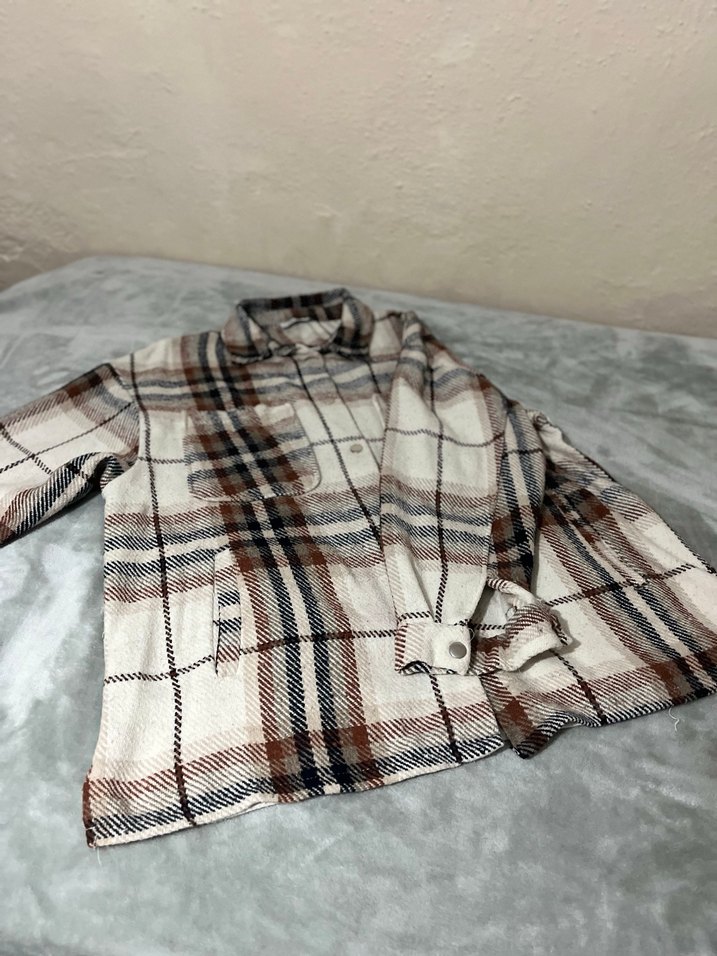 Düğmeli, uzun kollu ve kesik yakalı bu kadın gömlek, gri ve kahverengi tonlarında ekose desene sahiptir. Yumuşak ve sıcak kumaştan, midi boyda, rahat ve salaş kesimlidir.