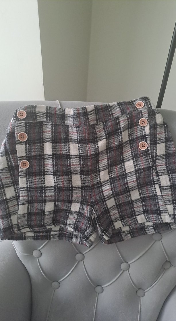 Düğmeli detaylara sahip, ekose desenli gri kız şortu, rahat streetwear tarzında yumuşak tekstil kumaştan üretilmiştir.