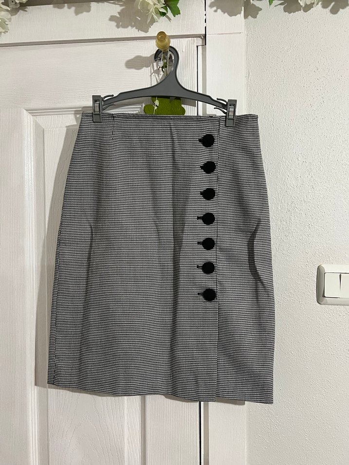 Gri renkli, ekose desenli ve düğmeli detaylara sahip midi boy hamile eteği. Ofis ortamına uygun, normal kesim ve iş tarzında.