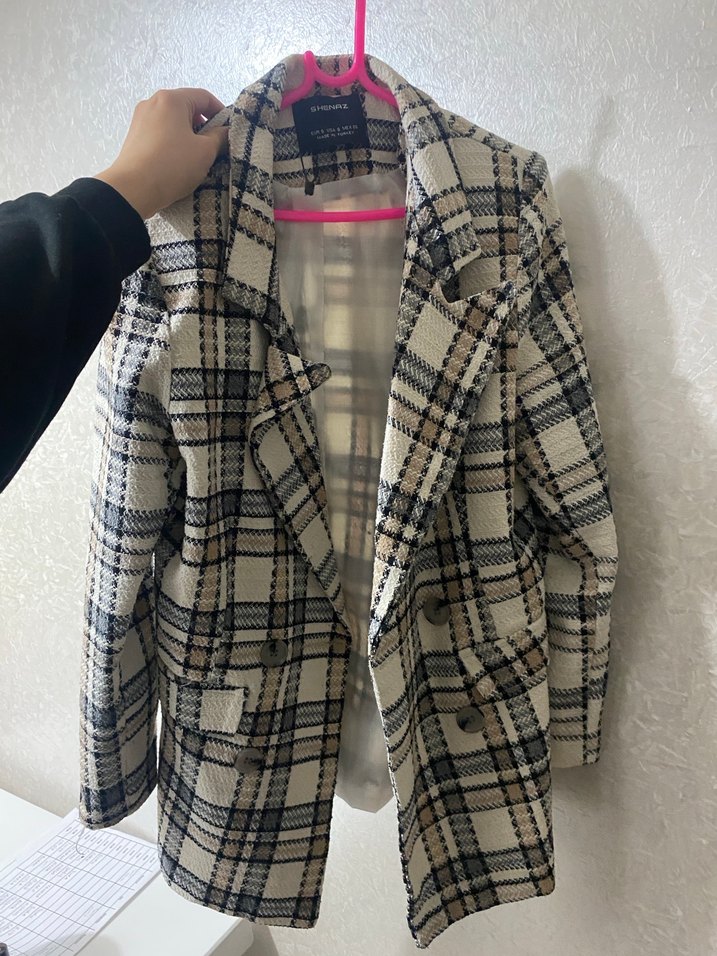Gri ve bej tonlarında, düğmeli, uzun kollu, ekose desenli, normal boy midi blazer. Sentetik kumaştan, rahat kesim, günlük sokak stili için uygun.