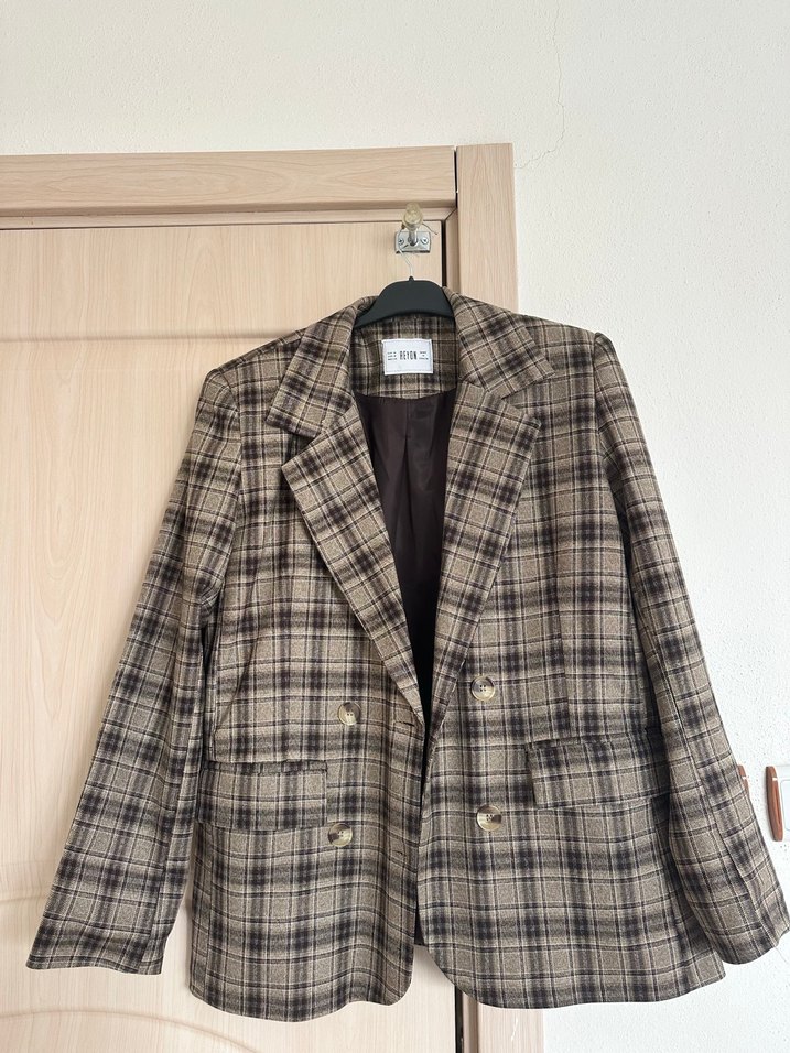 Düğmeli, ekose desenli kahverengi blazer ceket, normal boy ve strappy kollara sahiptir. Ofis ve günlük sokak stili için uygundur. Sentetik kumaştan üretilmiştir.