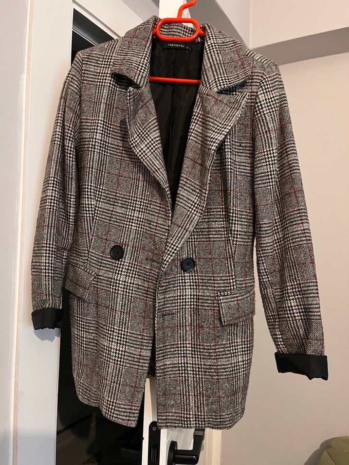 Düğmeli, ekose desenli kadın blazer ceket, normal boy, uzun kollu ve regular fit. Bordo ve gri tonlarında, sentetik kumaştan üretilmiştir. İş ve günlük stil için uygundur.Kumaşı gereği tüylenmeler oluşmakta temizlenince gitmektedir.Ürün birkaç defa giyildi.