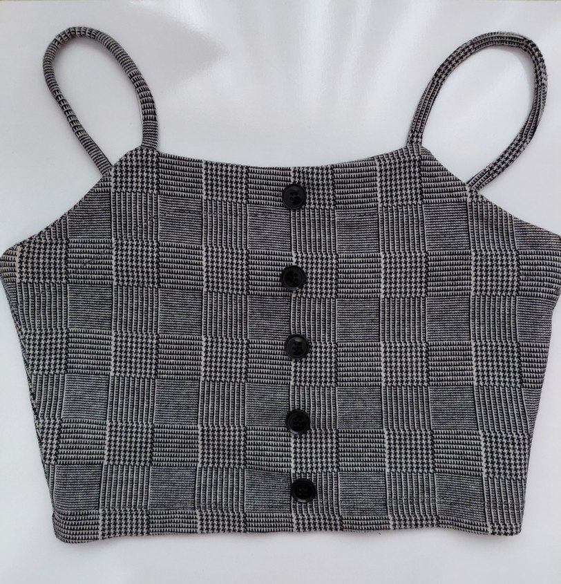 Gri renkte, ekose desenli, düğmeli, ince askılı, tekne yaka, günlük kullanıma uygun kadın crop top.