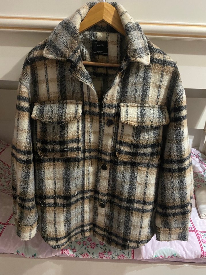 Düğmeli ön ve kesik yaka detaylı, yumuşak yün kumaştan kadın gömlek. Geniş kesim, uzun kollu, gri ve kahverengi ekose desenlidir, günlük kullanıma uygundur.