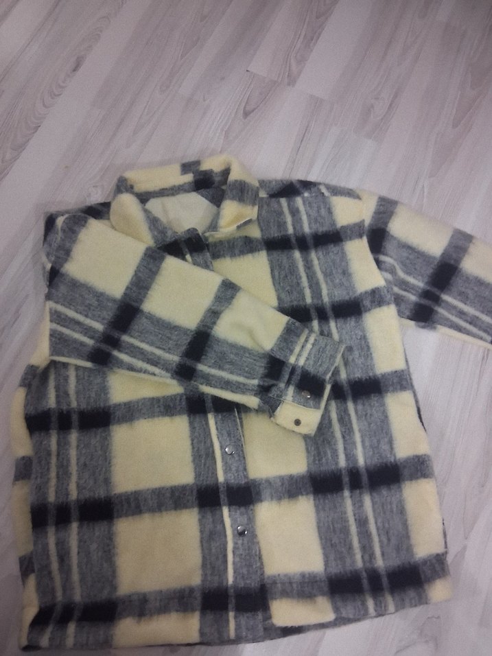 2 kol arası 63 cm uzunlul 68n.Hiç giyilmedi.Uzun kollu ve düğmeli, yumuşak ve sıcak kumaştan yapılmış gri ve krem ekose desenli kadın gömleği. Bol kesim ve günlük kullanım için uygundur.