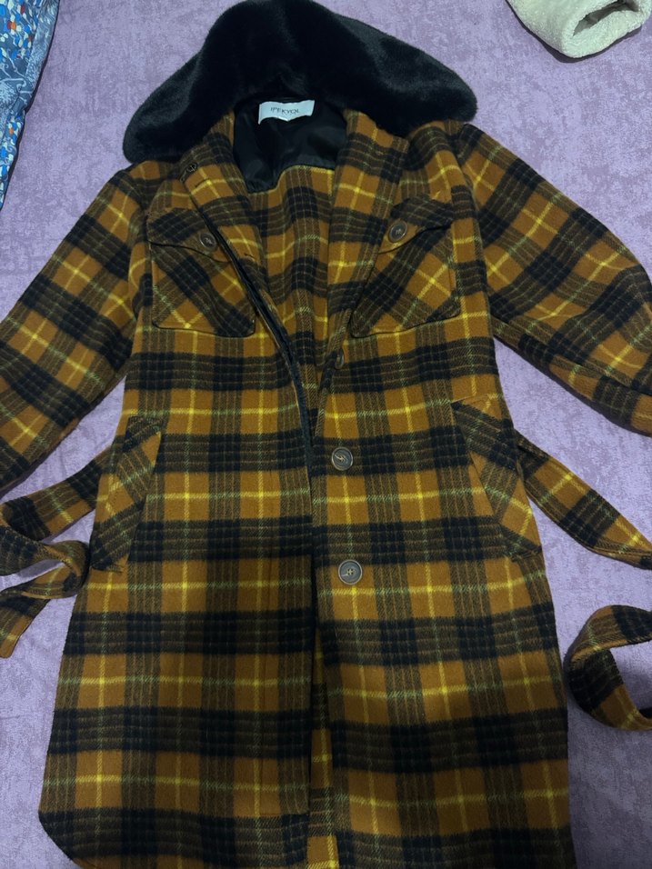 Düğmeli, uzun ve fitted kesim kadın kabanı, koyu kahverengi ekose desene sahip. Uzun kollu ve yumuşak, sıcak tutan kumaştan yapılmıştır.
