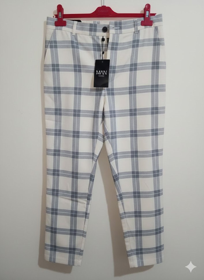 Gri ve beyaz ekose desenli, düğmeli ve normal boyda, rahat kesim kadın kumaş pantolon.