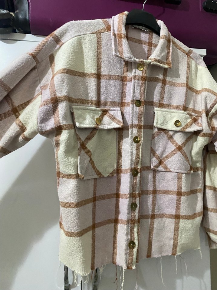 Bej renkli, düğmeli, uzun kollu, ekose desenli kadın gömleği. Yumuşak dokulu, bol kesim ve kısa boy, rahat sokak stiline uygun.