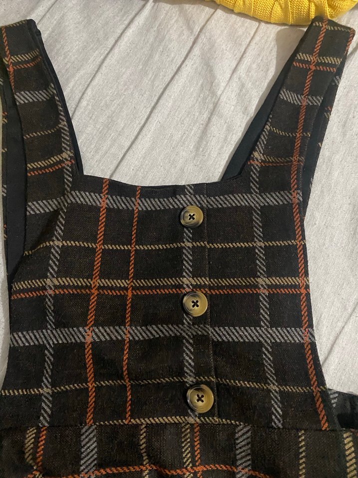 Düğmeli ve ekose desenli kadın şort tulum, askılı ve bisiklet yaka tasarıma sahiptir. Gri ve kahverengi tonlarında, günlük rahat kullanım için uygundur.