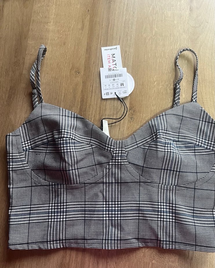 Ekose desenli, kısa ve fitted kesim gri büstiyer. Teknolojik kumaştan yapılmıştır.