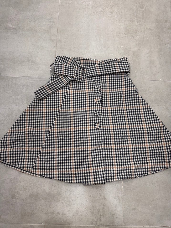 Bej ve gri tonlarda ekose desenli, düğmeli ve kemerli bol kesim mini etek. Rahat ve günlük sokak stili için uygundur.