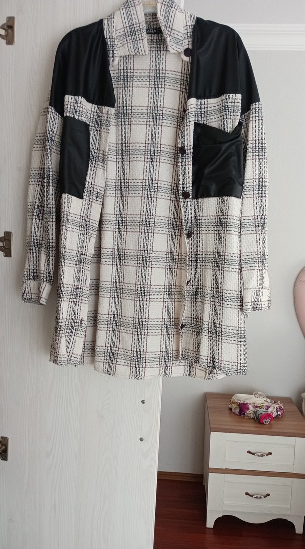 Düğmeli ön ve kesik yaka detaylı, bol kesim kadın gömlek. Gri ve beyaz ekose desenli, siyah cepli, sentetik kumaştan. Uzun kollu ve kısa boy sokak stili için uygun.