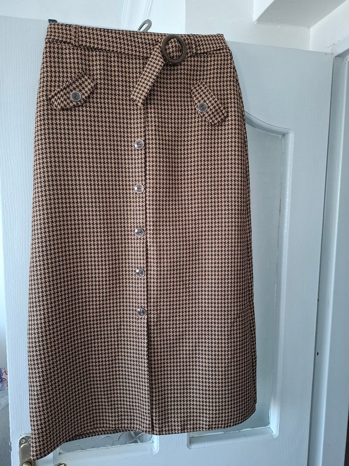 Düğmeli ön kısmı ve kahverengi-krem ekose deseni olan uzun kadın eteği. Kaşe kumaştan, klasik ve geleneksel tarzda, günlük kullanıma uygun. 42 - 44 beden uyumlu. Beli 41 cm. Boy 95 cm.