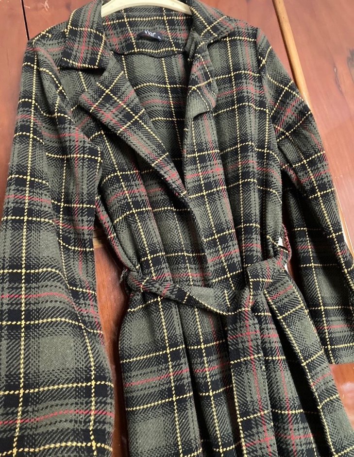 Düğmeli Ekose Desenli Uzun Kahverengi Kadın Kaban